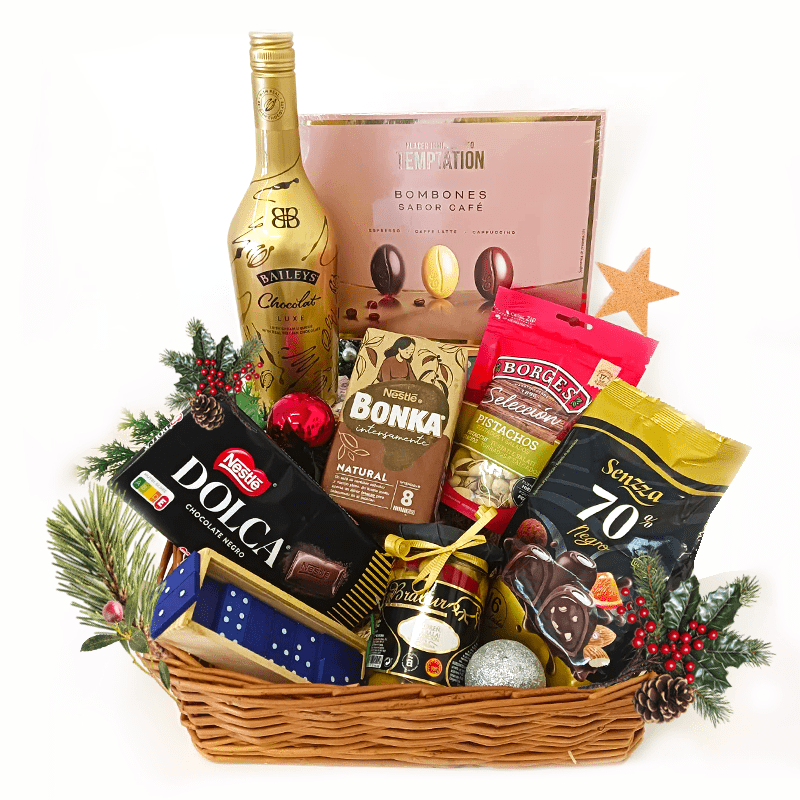 Un detalle perfecto para los amantes del buen gusto. Todo presentado en una cesta artesanal lista para regalar.